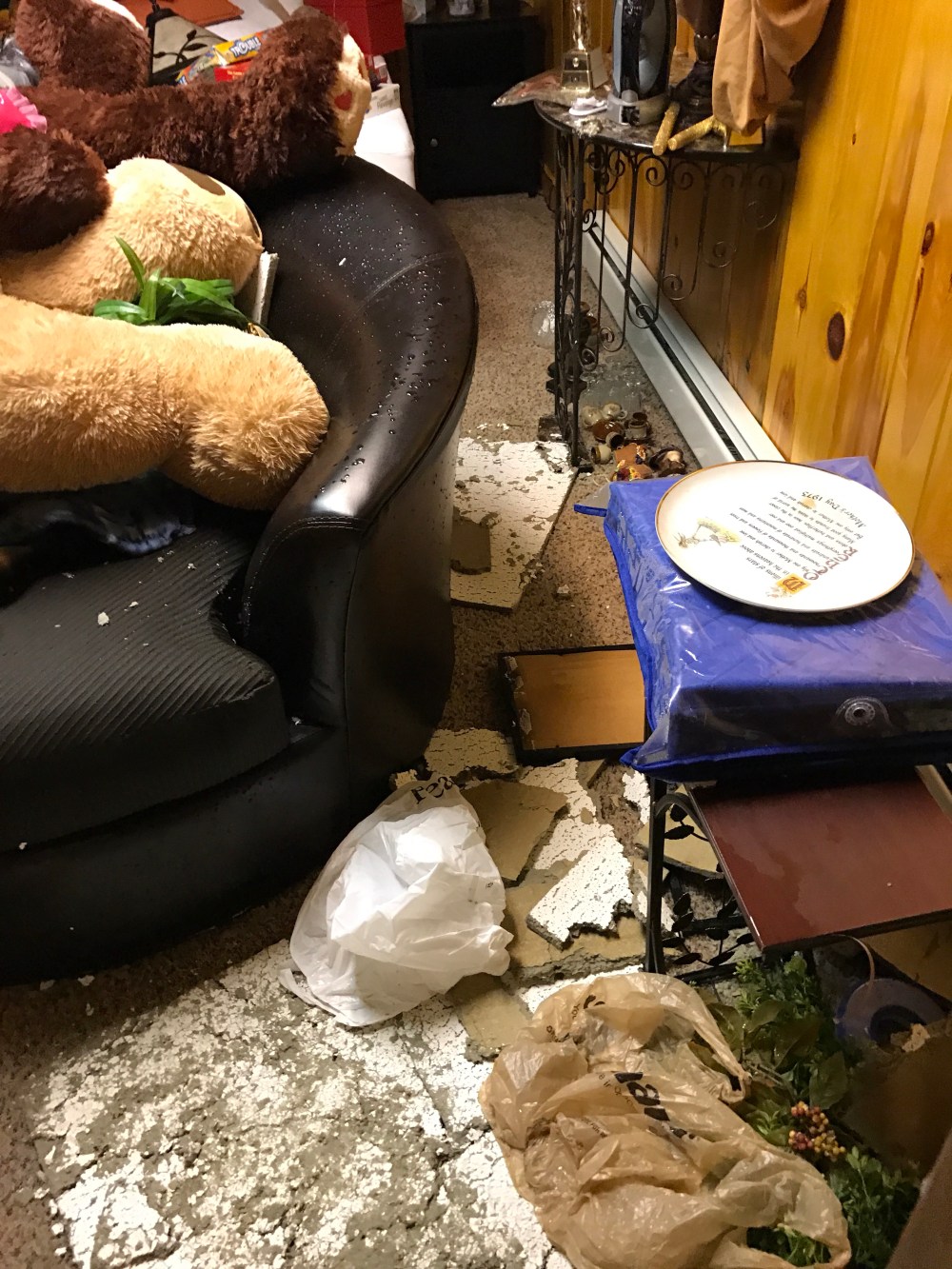 I made my way down the stairs and up comes Joey. Both of his hands holding his head saying, “I can’t believe this.” In 25 years, I have never seen my husband have this demeanor, the look of shock. “What happened?” I asked. “Several pipes burst and there’s water all over the basement.” Joey said. I made my way down the stairs. I looked at my husbands sneakers and there was a few inches of a water line on his jeans, around his ankles. I looked into the small hallway, that was near the downstairs bedroom and stopped. There appeared to have been just a few inches on the floor. I looked up at the ceiling tiles in the guest bedroom and a few had fallen from the ceiling, but they were not that wet. I thought how odd that was – did this just happen as we were on our way up to New Hampshire?