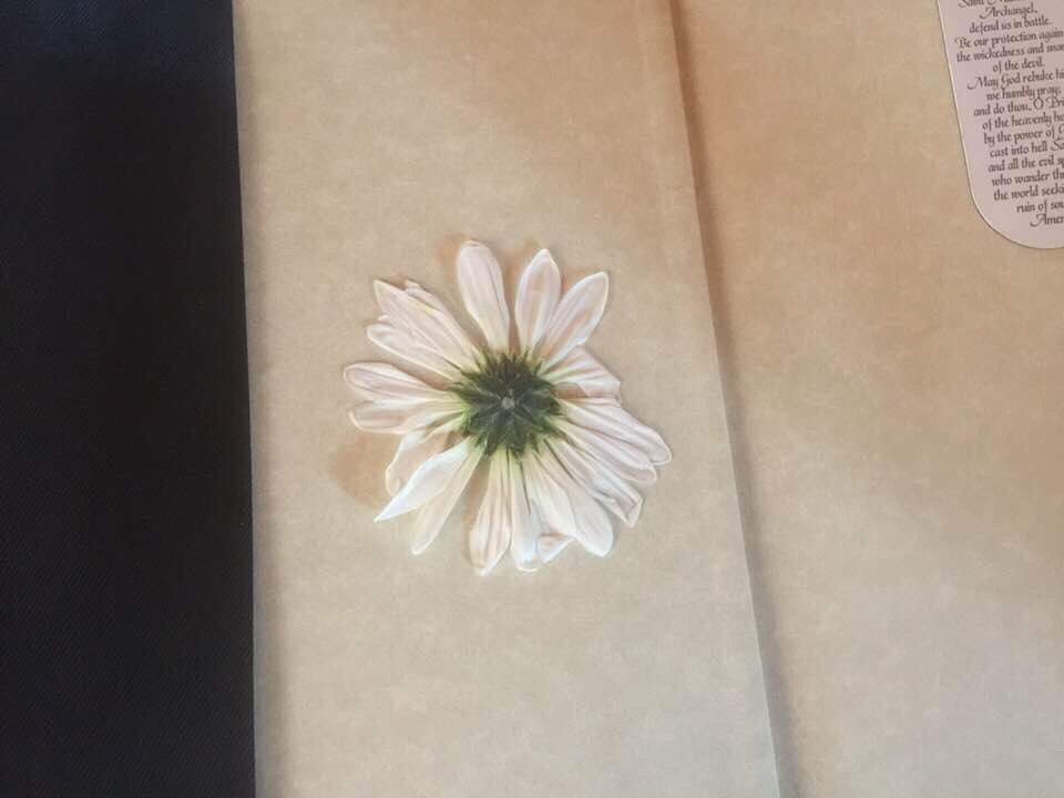 Joey and I were talking about the new Jerusalem Bible and how we felt that it was a wonderful traditional Bible. I always put a place mark in the Bible, where it is that I last left off during the last family meeting and I opened it up. We had never seen the Bible without the book cover on and so for some reason, that day, we decided to remove the cover of the Bible, which is made out of fabric. As I was removing it, I opened up the very front of the Bible and sitting there was a daisy that was upside down. At that moment, the Bible was open, the blue part of the sun light window that is in our living room, was shining directly on the Bible. I thought I was seeing things for a second, because my mind was not wrapping around it that, that- was a daisy, laying right there. I looked at my husband and then my son. It was at that moment, that God and Jesus reminded me about the First Five Saturday promises and about how our Blessed Mother said that the Saturday after the death of the person that recited the prayers and went through with it, She would come and get that person from Purgatory and bring them to Heaven. My husband got up and my son and they came over, I jumped up from my chair with my Bible and I brought it over to the table. Joey grabbed a paper towel and we put the paper towel on top of the Daisy and then flipped the book over so that way we could have the Daisy facing upwards. The thing about this Daisy, is there was absolutely no stem piece to the Daisy it was just the Daisy itself. The Daisy was cool to the touch. There are pictures below. I then remembered as I was sitting there that it’s Sunday and that our Blessed Mother went to Purgatory and picked Mom up and brought her to Heaven on Saturday, even though I had not fulfilled the First Five Saturday’s. To me, I was even shocked, I questioned it and I couldn’t believe it for a little bit, it just didn’t seem real.